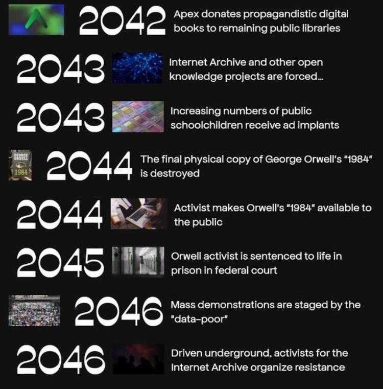 为此它预测了互联网未来 25 年将可能发生的大事件时间线,例如 2024 年将会通过严厉的数字版权法案打击免费知识、2034 年全球最大的三家出版商合并垄断数字媒体、2046 年互联网档案馆将会被迫转入地下活动。