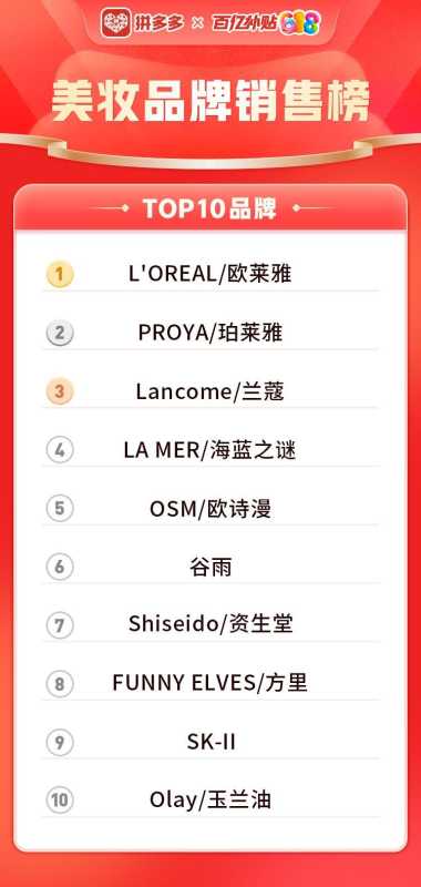在美妆类目中,欧莱雅和珀莱雅分列前两名,且销量十分接近,其他排名依次为兰蔻、海蓝之谜、欧诗漫、谷雨、资生堂、方里、SK-II、玉兰油。