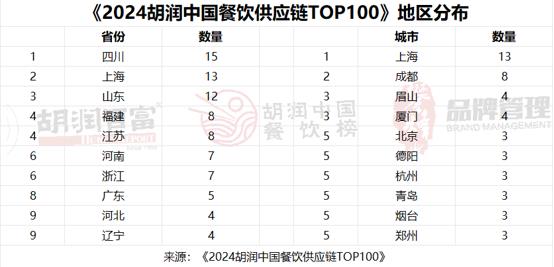 《2024胡润中国餐饮供应链TOP100》榜单中,86%的企业为食材/调味料企业,14%为设备/耗材企业。四川、上海和山东是上榜餐饮供应链企业最多的省份,而上海以13家上榜企业在城市排名中位居第一。其中,海天、牧原、泰森食品、田野股份等知名企业上榜。