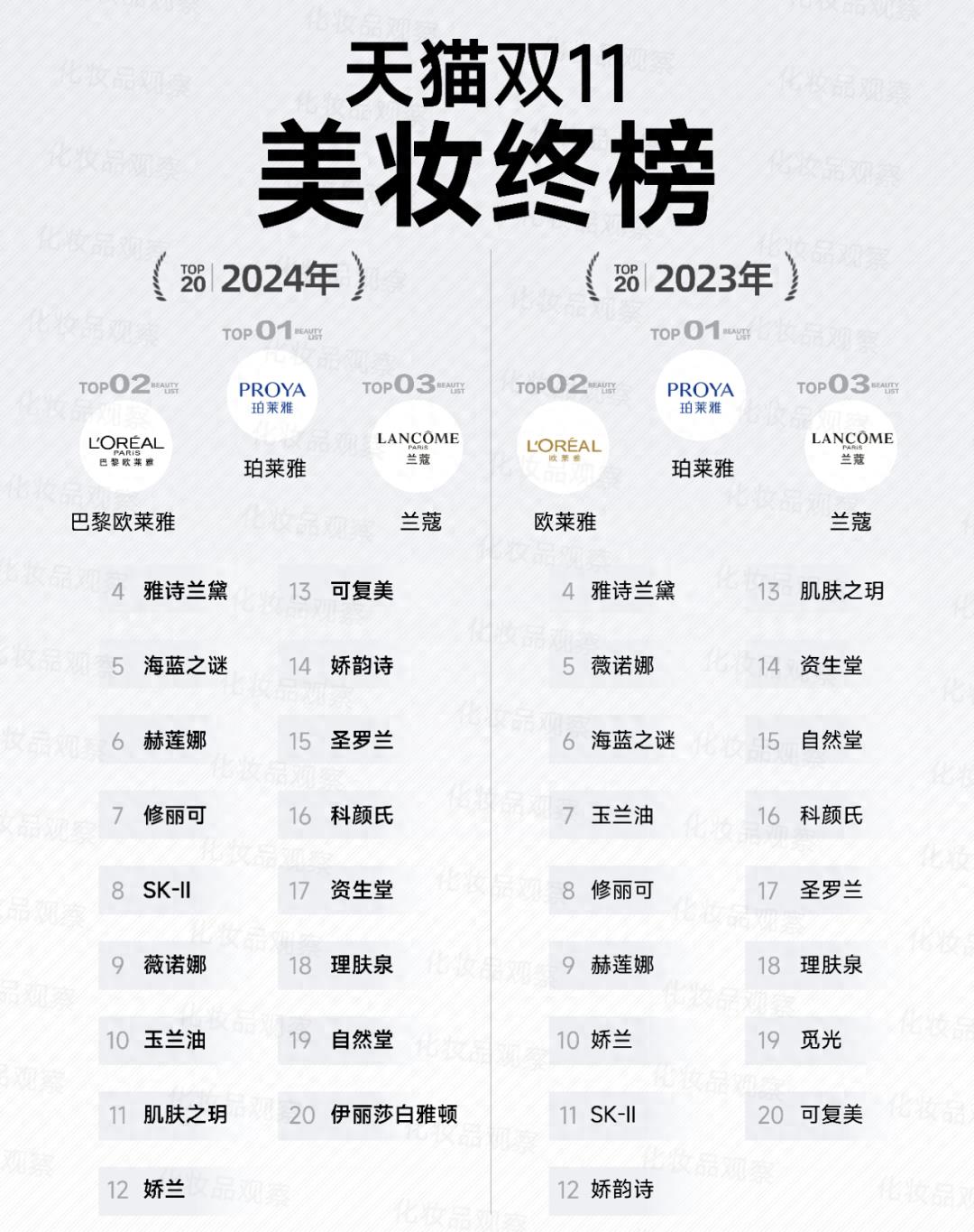 榜单来源《天猫大美妆》;2024年双11统计维度:10月21日20:00-11月11日24:00;2023年双11统计维度:10月31日20:00—11月11日24:00