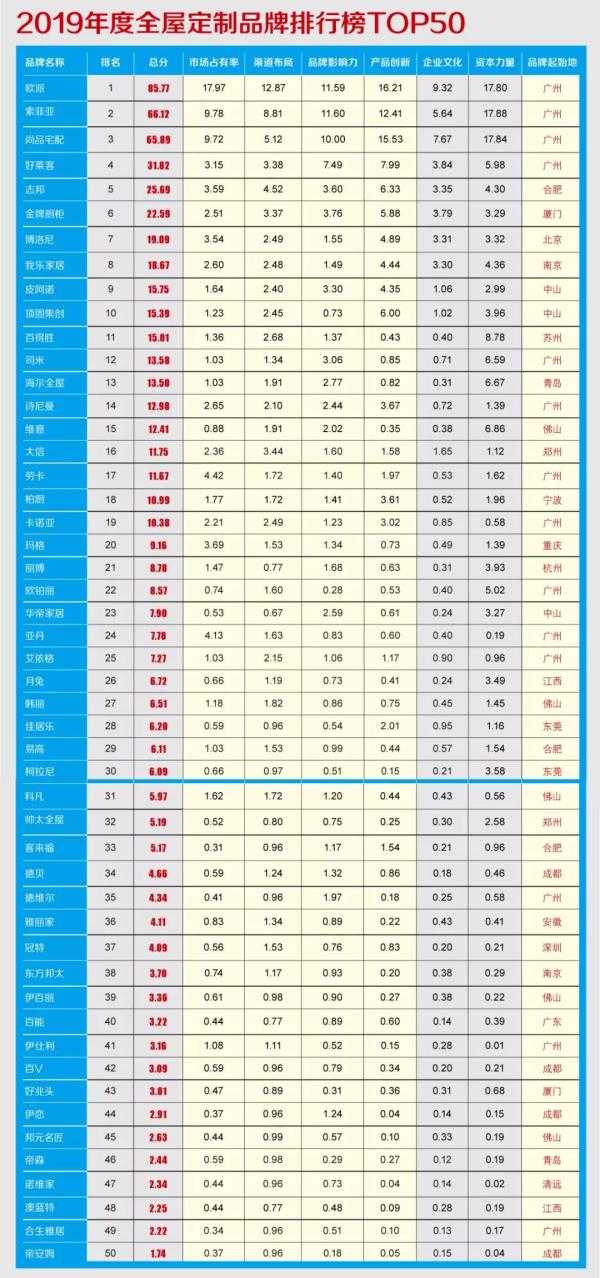 2019年度全屋定制家居品牌价值排行榜TOP50重磅发布