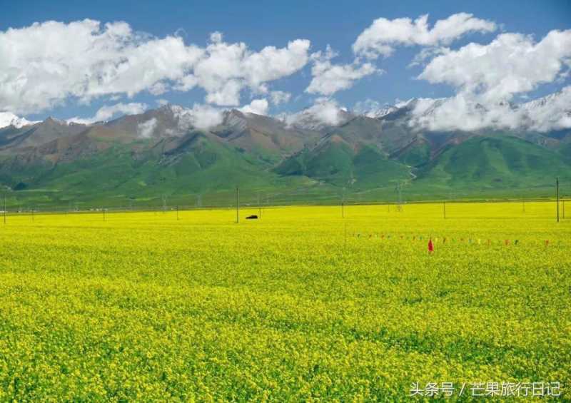 蓝天白云下,远处的祁连山山脉连绵不断,山峰上还有皑皑白雪,近处是黄得浓艳的的茫茫油菜花,宛如金黄的大海,中间还夹杂着绿色的草地,远远看去,像块巨大的黄金地毯。