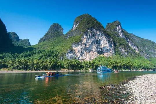 "桂林山水甲天下"的核心地带,喀斯特地貌与竹筏漂流构成水墨长卷。