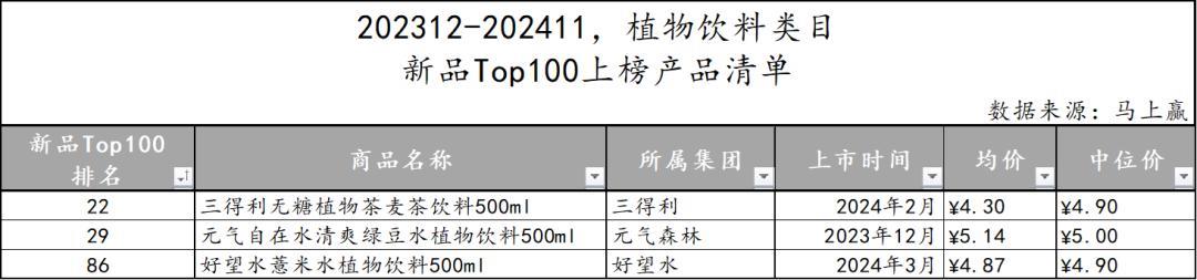 在对TOP 100 SKU的新品类目归属梳理之后,可以看到,植物蛋白饮料、能量饮料、营养素饮料、即饮奶茶四个类目下并无新品进入TOP 100 SKU行列。