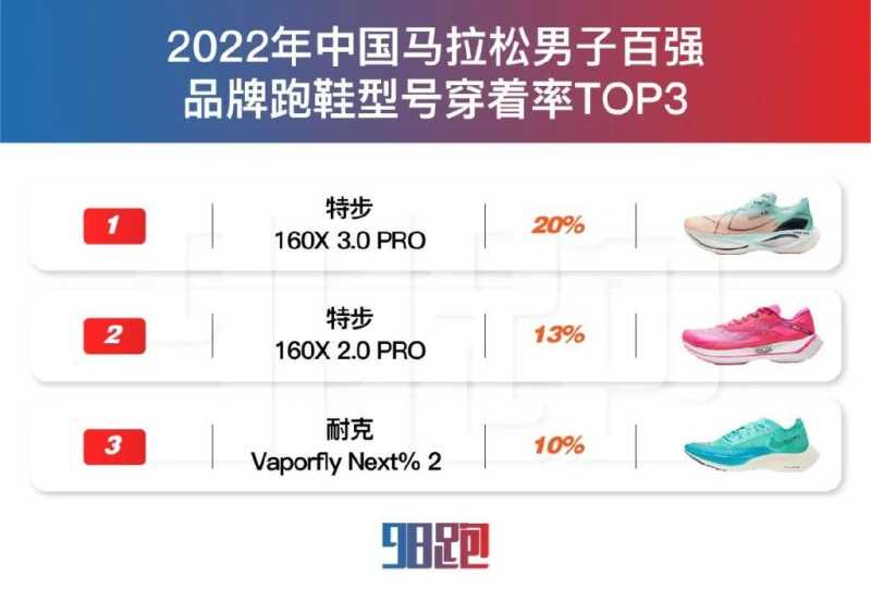 2022中国男子马拉松前十榜单中,其中六位是穿着特步冠军版跑鞋创造。2021年前十榜单,这一数据是前十中占据七席,并且包揽了前六位。
