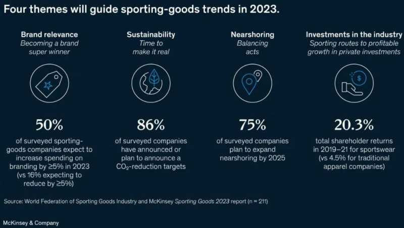 报告认为,四大主题将引领2023年体育用品业发展,分别是品牌关联性、可持续性、近岸外包与投资。
