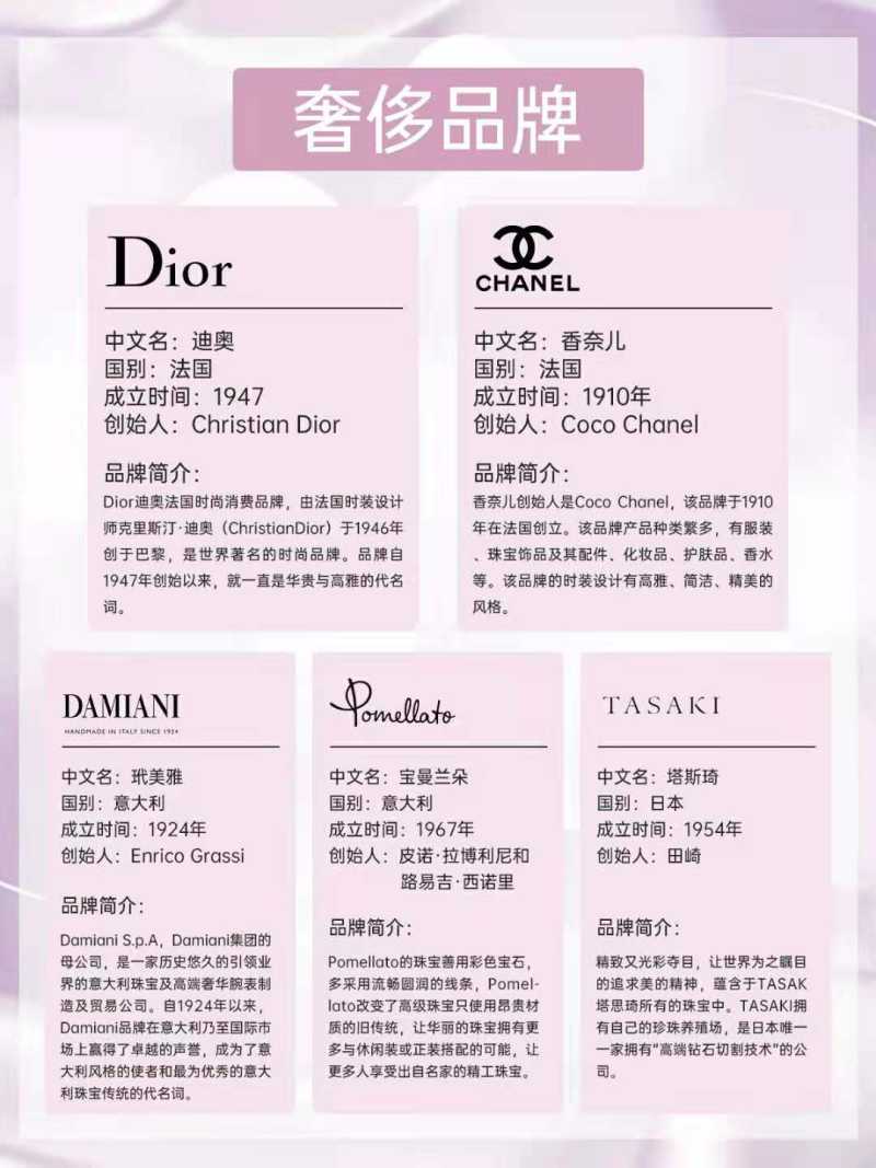 奢侈品牌:达米阿尼、戴比尔斯、宝曼兰朵、迪奥Dior、香奈儿 Chanel、塔思琦。