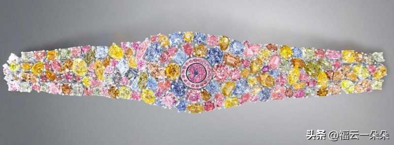 这枚手表由201克拉钻石组合而生,其中包括15克拉粉钻、12克拉蓝钻、11克拉白钻、163克拉小黄钻和白钻。874颗钻石围绕在表盘周围,虽然形状奇怪,但却是一个精彩绝仑的大师级作品。
