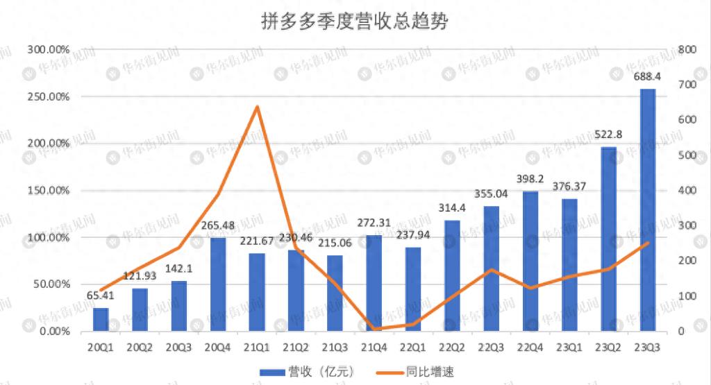 2023年11月28日,拼多多发布截至9月30日的2023年第三季度业绩报告:营收688.4亿元,同比增长93.9%;实现美国通用会计准则口径净利润155.4亿元,净利润率达22.6%。