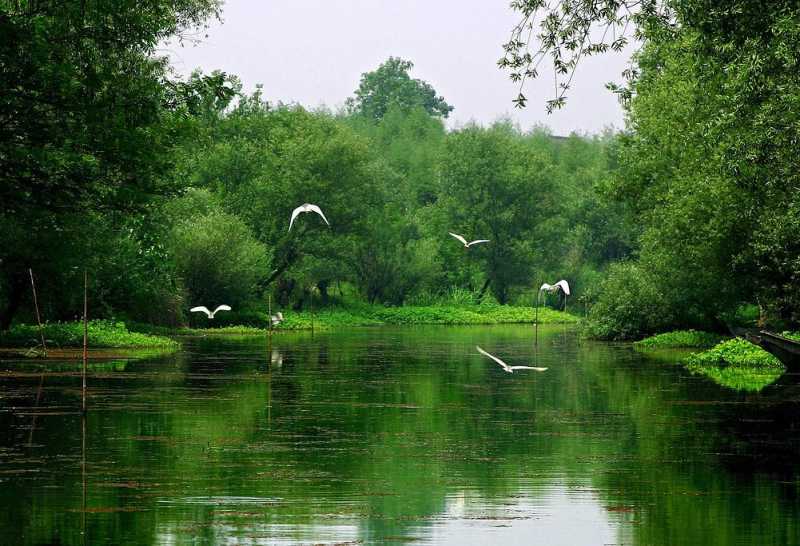 浙江杭州西溪国家湿地公园位于浙江省杭州市西湖区和余杭区西北部,距西湖不到5千米,规划总面积11.5平方千米,湿地内河流总长100多千米 ,约70%的面积为河港、池塘、湖漾、沼泽等水域。湿地公园内生态资源丰富、自然景观幽雅、文化积淀深厚,与西湖、西泠并称杭州“三西”。是中国第一个集城市湿地、农耕湿地、文化湿地于一体的国家级湿地公园。
