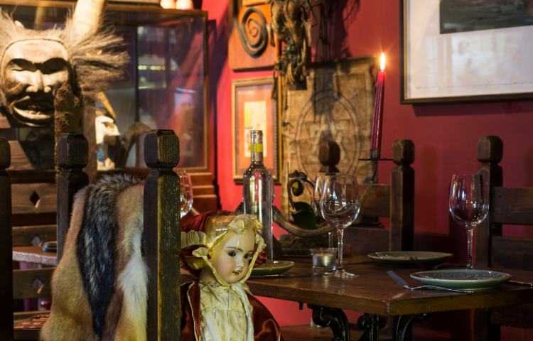 好奇心博物馆的一楼是一个酒吧,只提供那些看上去“神神叨叨”的鸡尾酒,比如“和尚的酒”“女巫的心脏”,或者“缩头功”酒(Shrunken Head),调酒师的前台,挂着一排已经被做成标本的动物脑袋。