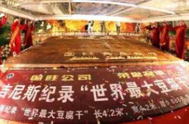 世界上最大的豆腐干就诞生于我国的四川省宜宾市,在当地的豆腐干食品文化节上,一块长达4.21米的超级豆腐干亮相了,当时收到了英国吉尼斯总部的认证,成为了世界上最大的豆腐干,据说在制作的时候使用的黄豆就高达2500多公斤。