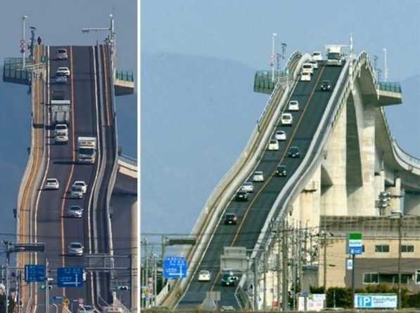 日本江岛大桥虽然这是一座只有1.7公里的大桥,但也确是瞬间攀升,陡度最大的公路,很多人才质疑能不能开车爬的上去,就算开上去,很快就要惊心动魄地开车下坡了,不愧是世界上最危险的九大公路之一。