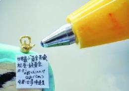 当然毫米级的茶壶制作起来并不容易,即便是像高卫星这样熟练的微艺艺人也不例外,据他回忆,当时本来是选择的黄铜来制作茶壶的,期间花费了几天的时间才完成了大致的一个壶型,但是可惜的是,当时他在阳台用镊子夹住茶壶迎着太阳光查看的期间,却不小心将茶壶捏的太紧,导致它最终飞下了楼,当时他还急的不得了,但找了几小时也没找到。