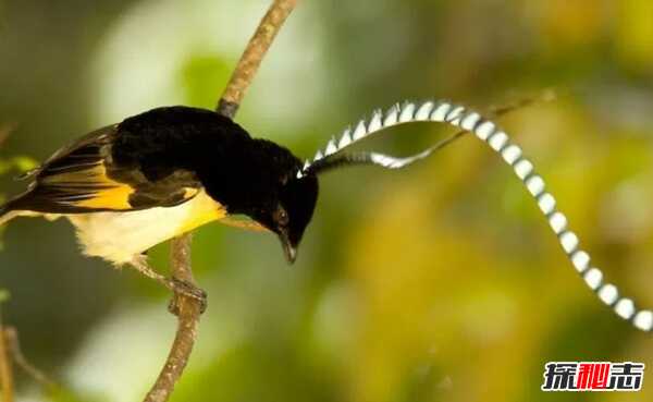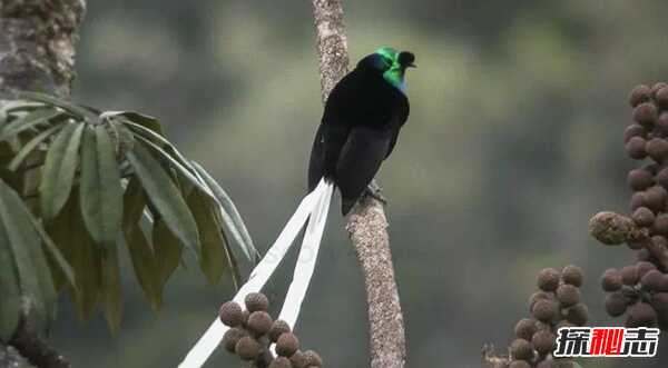 这只鸟也是新几内亚特有的,生活在山坡上。它有很长的尾巴,是装饰性的,而不是功能性的,可以长达50厘米。这些羽毛的长度决定了雄性的健康状态,并帮助雌性选择配偶。除了尾羽,雄性还会发出响亮的声音,与其他雄性竞争配偶。这使它成为世界上最奇怪的鸟类之一。