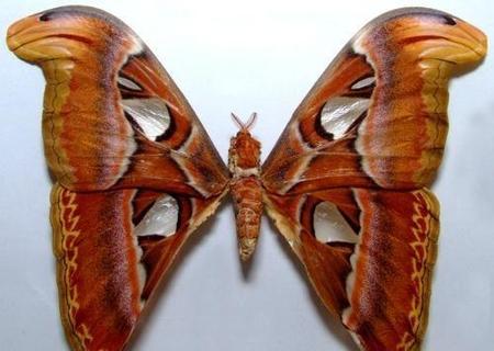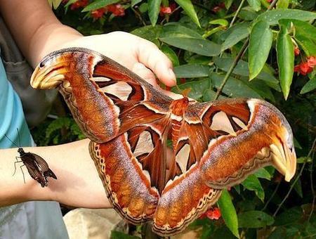 当它们还是一只毛毛虫时,体长可达11厘米!阿特拉斯飞蛾,生存于东南亚的热带和亚热带森林中。前部和后部是生锈的棕色,有黄色,紫色,黑色和红色的轮廓,有一点欧洲古城堡的风格!它的翼尖类似于蛇头,有时候会吓跑很多潜在的掠夺者。
