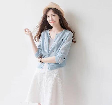 你还可以里边穿个连衣裙或者是短袖外面套个小开衫儿,上面不要扣扣子,这样也能遮挡一部分,很漂亮的哟。但是,袖子不要太紧,不然会显胸大。