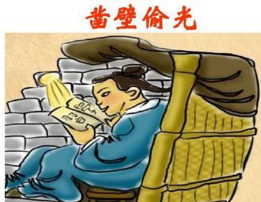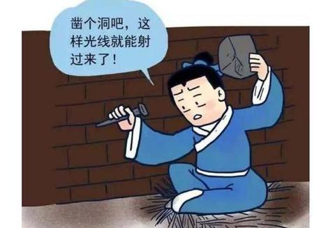 西汉时著名的经学家匡衡,幼年时期,家里贫穷,买不起蜡烛,他常常读书读到黄昏日暮,才遗憾地收起书本。有一天晚上, 他突然感到什么地方有微弱的光亮射来。睁眼搜寻,他发现原来是自家墙破,邻家烛光由墙的缝隙中透出。于是他找来凿子,把墙上的缝隙凿大,果然有了一束亮光。他拿书就着光束去看,直读到邻家熄灯之后。由于勤学苦读,匡衡的学问长进很快,后来受到汉元帝赏识,被封为安乐侯,当上了宰相。