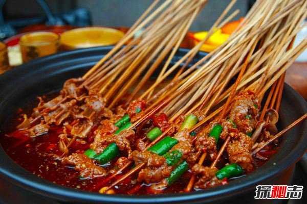 四川串串香来自四川乐山,这是四川比较有名的传统小吃,实际上和火锅有点类似。大家在竹签上面串着不同的菜,然后在锅里煮熟蘸料吃很美味。