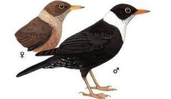 白颈鸫体长23-28厘米,雄鸟通体黑色或褐黑色,颈部有一圈明显的白色,尾下覆羽具有白色纵纹,嘴橙黄色,眼圈黄色;雌鸟棕褐色,下体稍淡,颈部一圈是灰白色。总的来说,白颈鸫雌雄特征明显,在野外很容易识别。