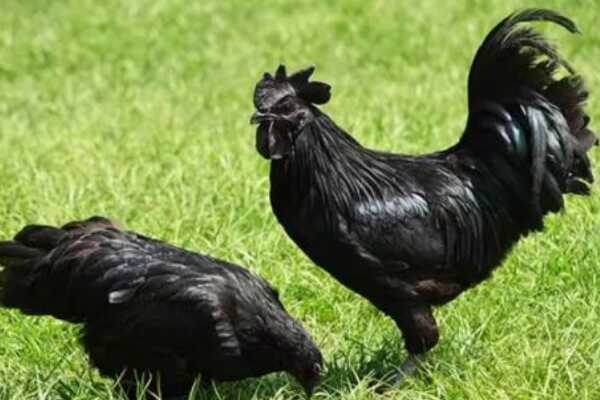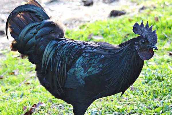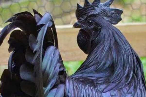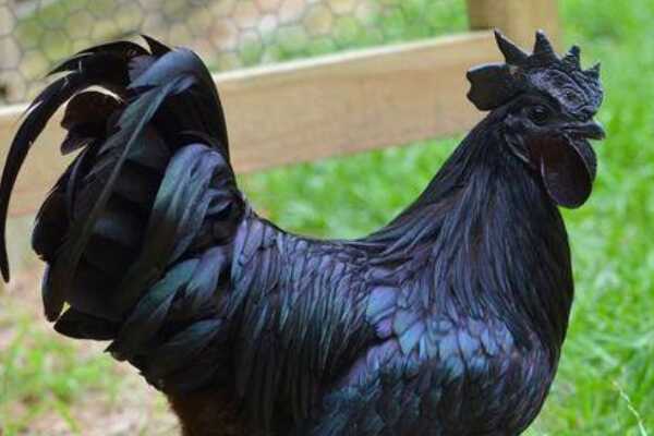 这种产自印尼的金属鸡最独特的一点就是它的全身几乎都是黑漆漆的,不仅是鸡冠还有脚趾,哪怕是嘴壳也都是完全黑色的,就算是公鸡的尾巴羽毛也不是五颜六色的,依然是黑得发亮的长尾羽,而母鸡生下的蛋也几乎都是黑色的壳,就连鸡的耳朵、舌头以及眼睛等,甚至是内脏都是黑色的。