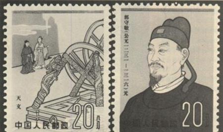 比如,比如在1962年时,我国邮电部发行的古代科学家,有八枚纪念邮票一套,其中有蔡伦、孙思邈、沈括,当然还有郭守敬,其中第七、第八枚就是郭守敬的像和他的发明。