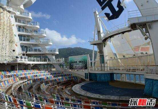 “海洋绿洲”号有可容纳750人的竞技场,还有溜冰场、冲浪机、高台跳水表演场地。从各项数据来看,海洋绿洲号刷新了多项邮轮业界的吉尼斯纪录,可谓当之无愧的世界上最大的邮轮。