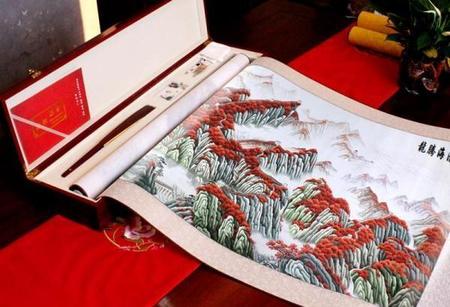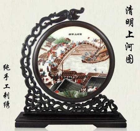 像是知名度比较高的一些人像及名画,这些东西又以另一种方式制作出来,比如名画《清明上河图》《五牛图》《源远流长》《千里江山图》《簪花仕女图》《富春山居图》《鸿运当头》《聚宝盆》《迎客松》《万里长城》《马到成功》《宝骏图》《福》《寿》《龙凤呈祥》就是这些的画作用手工刺绣做出的卷轴画作礼品,刺绣摆件以及刺绣装饰画作品。