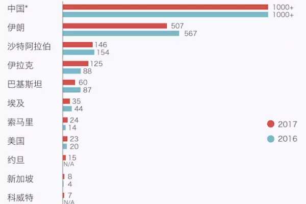 在2018年由国家特赦组织发布的这套榜单中,中国不管是2017年还是2016年的数据都是远超1千人的,这可能也是因为中国法律中规定的死刑处罚最多,据统计至少有55个罪名是执行死刑的,但其实他们并没有明确的数据。不过其他排在前五的国家则有比较明确的数据,基本上都在600人以下,仅次于中国的就是伊朗,2016年有567人,而2017年下降到了507人。