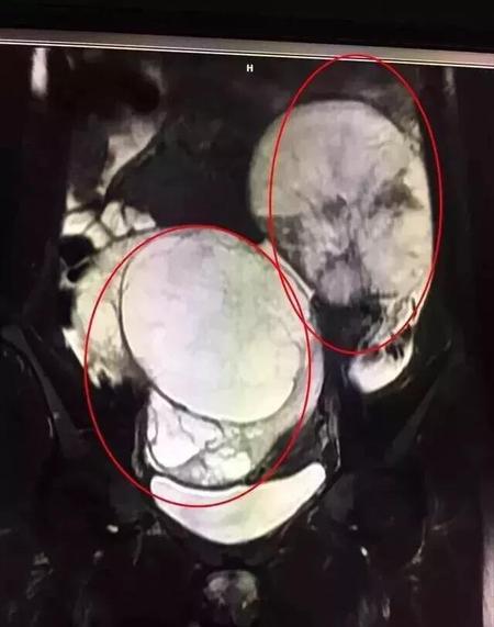 还见过一个32岁,停经2个月,腹部逐渐隆起就诊,都以为是怀孕了。做了超声发现,不是怀孕,而是双侧卵巢各长了1个10cm大的肿瘤,一共20cm大的肿块在肚子里,跟怀孕的症状一样,让人错以为怀孕了。下图。