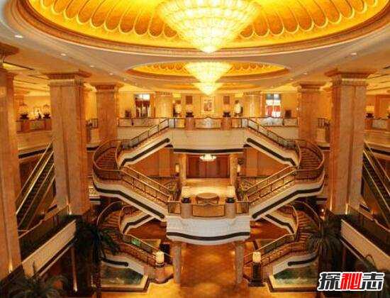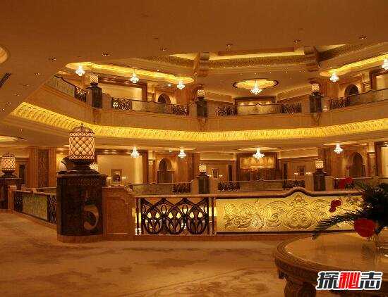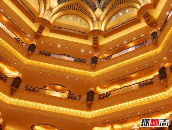 世界上最豪华的酒店内部面积达24万2820平方米,但客房只有不到400间,酒店内还有一个面积达7000平方米、是中东地区最大型豪华礼堂,可容纳1200人开会。一个可容纳 2,800 人的舞厅。有12个餐厅和 8个娱乐厅,配有 128 间厨房和餐具室,可同时接待 2000 多人就餐。另有 40 个会议室和附带 12 个工作间的新闻中心。从饭店通道一头走到另一头,长近千米,有时客人在饭店用餐或购物后经常找不到房间,得找服务员领路才能“ 回府 ” 。