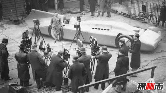 1935年,马尔康姆·坎贝尔爵士正在他的坎贝尔-里尔顿蓝鸟车面前面对镜头摆姿势拍照。1935年,他将这辆车运到了美国犹他州,向他自己保持的记录发起冲击,并最后在罗尔斯罗伊斯RV12引擎的帮助下如愿以偿的以301.337英里(约485公里)时速刷新了记录。