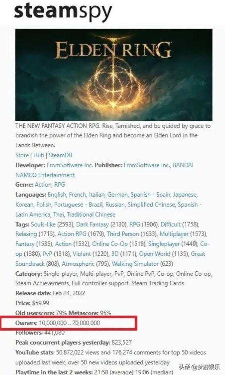值得一提的是,SteamSpy只会显示游戏的销量估算(基于拥有游戏的玩家数量),并且SteamSpy只会追踪公开个人资料的玩家,这意味着那些拥有游戏但未公开个人资料的玩家不会被计算在内,因此这款游戏的实际销量只会更多,这也是页面上标记有1000万~2000万玩家拥有《艾尔登法环》的原因。