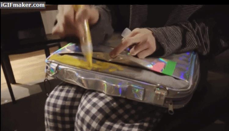 并且他的画布并不是简简单单的白纸,而是身边任何一样可以作画的物品,比如今天背的双肩包、比如马上要穿的帆布鞋