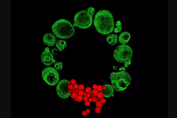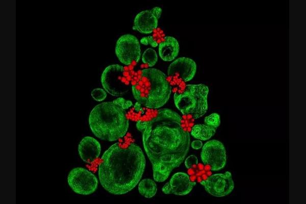 当然像英国的这位教授一样浪漫的科学家还有很多,比如尼康显微镜摄影奖的作品中就有一副叫做细胞圣诞树的图案,就连颜色也是经典的红配绿,上面的绿色细胞就是胶原细胞,而红色的则是脂肪细胞,这些细胞都来自人类的骨髓。