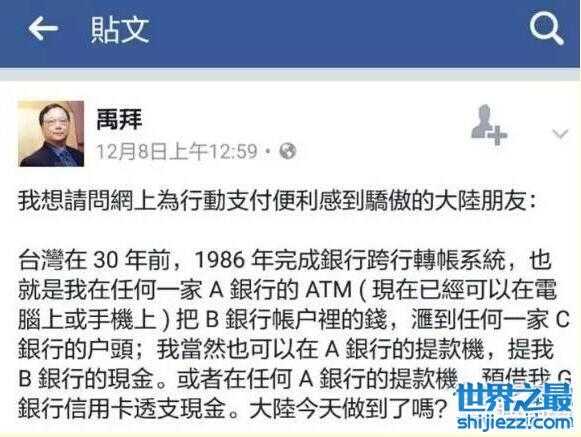 注意,他不是询问,不是提问,不是疑惑,而是讽刺和嘲笑!在他意识里,大陆是刷不了信用卡的!大陆是没办法跨行转帐的!而当台湾人在大陆发现,真的太方便了,出门完全不用带东西,只需要一个手机,就能够解决所有的问题,不出门都可以让外卖送过来,超市都可以送货上门,比台湾方便多了。相关文章阅读:世界第一宅男。