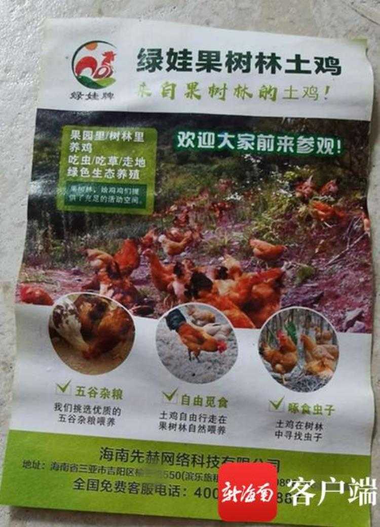 投资人贺先生向记者出示了一份“绿娃果树林土鸡”的宣传单,上面宣称绿娃牌果林鸡绿色生态养殖,吃五谷杂粮、自由觅食、啄食虫子。但宣传单落款的是海南先赫网络科技有限公司,并非投资人签署的认购代养销售协议书上的甲方——海南绿娃养殖集团有限公司。