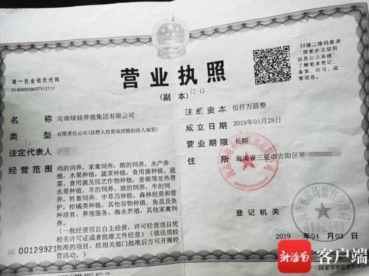 记者通过网上查询,海南绿娃养殖集团有限公司目前的法人姓黄,成立时间是2019年3月28日,注册地点在海南省三亚市吉阳区河东路凤凰水城A区低层住宅A23栋(EC型)101号房,经营范围为鸡的饲养、家禽饲养、鹅的饲养、水产养殖、水果种植、蔬菜种植等。据投资人朱先生反映,“之前公司的法人姓段,这个注册地点也是后来更改的,一开始的地点在榆亚路,前段时间我专门去了新的注册地点看了,但也关门了。”
