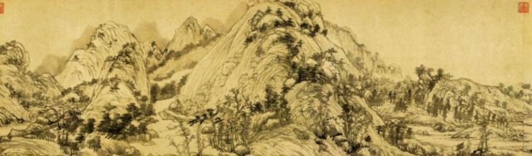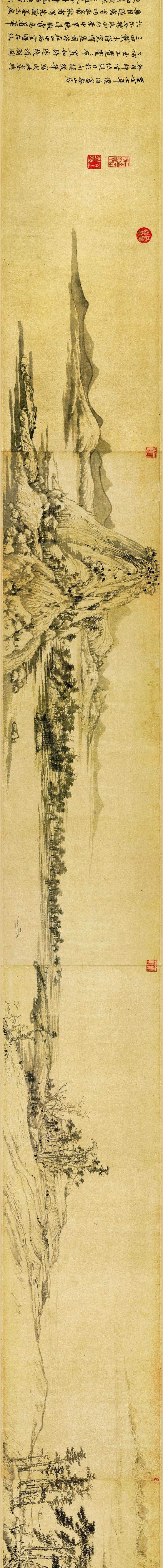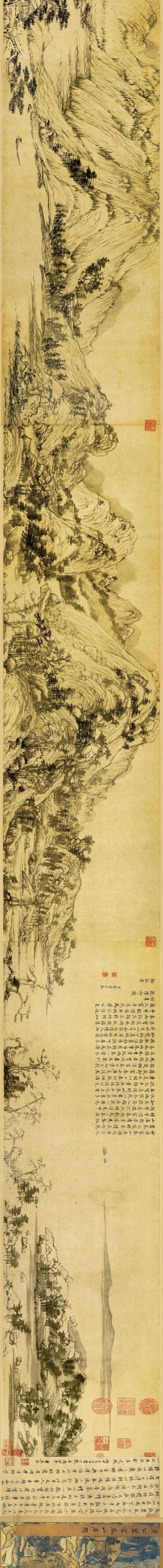 第一部分:剩山图从一座顶天立地浑厚大山开始,长篇巨制,拉开了序幕,图画上峰峦收敛锋芒,浑圆敦厚,缓缓而向上的土堆,层层叠叠渐进堆砌着,又转向左方慢慢倾斜,黄公望使用他最具独特见长的“长披麻皴”笔法,用毛笔中锋有力向下披刷,形成画面土壤厚实的质地,山岚白色雾气迷蒙,表现出江南山水湿润的独特气候之特色。