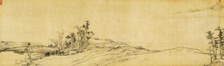 第五部分至第六部分中宽远的白沙,留白处两艘小船并行江中,船上渔夫也只是点景,微小的身影,渺小的生命,在整片的留白中,一如一颗尘埃。远处一片远山,笔的线描,墨的拖带,交织在一起,一直延续在后面的大段留白中。