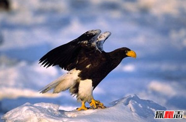 在俄罗斯和日本发现的,主要以鱼类为食,但有时攻击其他大型鸟类,它是世界上最重的鹰,重达9公斤,翼展近2.5米。它的喙也是所有鹰中最大、最有力的,不幸的是,它们是一种濒危物种,由于铅中毒,它的数量减少了。
