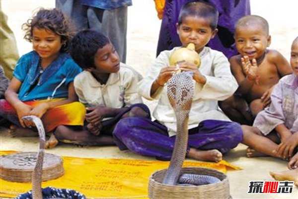 据说印度的小孩能徒手抓眼镜蛇,看的简直头皮发麻,不过也有资料显示印度人在玩蛇时,会在身上涂抹一种草药,能让蛇不轻易咬人,而且为了防止出现意外,有些蛇的毒牙已经被拔掉了,所以连小孩子和女人都敢轻易的碰蛇。蛇在印度人的眼中只是宠物一样的存在,从小就和蛇玩在一起,所以无所畏惧。