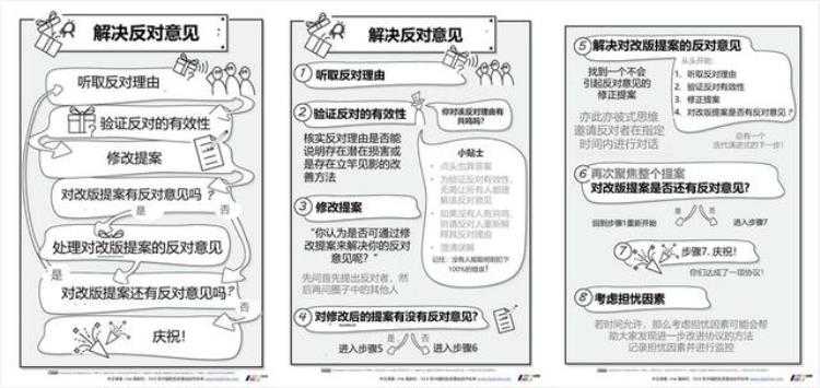 比如,在上面说的反对意见解决的过程中,两位组员就一个小问题的争论,必须在1分钟时间内完成。这要求两个人极其简要地陈述自己最核心的关注点,然后快速达成一个“看起来足够好、尝试一下也足够安全”的方案。一分钟之后,这个会议的确可以继续往下推进了。