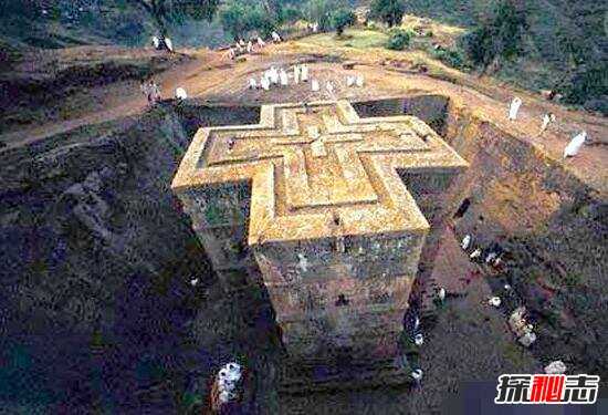 传说,12世纪埃塞俄比亚第七代国王梦中得神谕:“在埃塞俄比亚造一座新的耶路撒冷城,并要求用一整块岩石建造教堂”。国王按照神谕在埃塞俄比亚北部海拔2600米的岩石高原上,动用2万人工,花了24年的时间凿出了11座岩石教堂,人们将这里称为拉利贝拉。从空中俯瞰,这座教堂犹如一个巨大的十字架矗立于大地上。这座教堂坐落在一个很深的岩石坑内,一个地下通道连接着它的入口,其内部装饰和陈设都极为朴素而庄严。