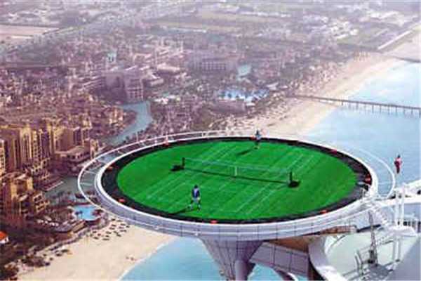 这个世界上最悬的网球场因为它的高度令人惊奇。它在一片靠近岸边的海面上。从上面向下看就可以看到翠绿的海水。这个网球场靠着宾馆大楼,人们可以从宾馆顶楼来到这里。这个网球场仅靠一根柱子支撑重量,形状像一个巨大的平菇。依靠着宾馆大楼也给它增加了安全系数。这么奇特的网球场成为了当地的一个特色景观,几乎每个名人来到迪拜都会来这里参观,甚至会进行网球比赛。