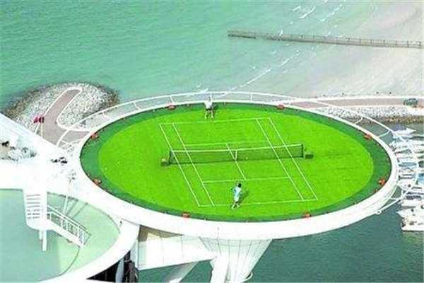 世界最悬网球场场是位于迪拜海域的网球场,是世界上最豪华的宾馆的配置。这个网球场高出地面三百多米,是当之无愧的世界上最悬的网球场。它因为远远超出地表的高度和可以俯瞰整个迪拜的风景被世人皆知,并且拥有了“世界上最高的运动场”的吉尼斯世界纪录。而这个网球场的前身却是一个停机坪。