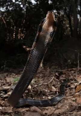 眼镜王蛇(学名:Ophiophagus hannah)是世上体型最长的毒蛇,体长最大可达5.6米,平均体长也有3到4米,眼镜王蛇多栖息于沿海低地到海拔1,800米的山区,多见于森林边缘近水处,昼行夜伏,在我国主要分布于华南和西南地区。它的主要食物就是与之相近的同类——其他蛇类!