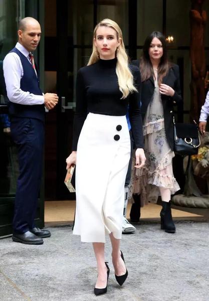 她让我印象最深刻的一次显高穿搭,就是去年这身,黑色上衣搭配白色半裙和高跟鞋,看上去腿长1米。