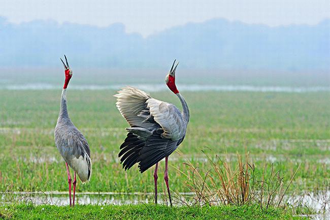 赤颈鹤的习性赤颈鹤的头部,喉咙以及脖子的上端呈现鲜红色,这也是它名字的由来,这种红色在繁殖期的时候会更加的鲜艳,其他部分都是白色或灰色,腿脚则呈现粉红色,头顶是没有羽毛的,呈现白色,拥有尖利强壮的喙部,在秋季会成群的活动,有时数量可达上百只之多。