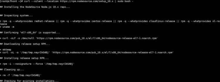 输入命令curl --silent --location https://rpm.nodesource.com/setup_10.x | sudo bash - (命令解释:管理员权限使用curl命令从url下载软件包)